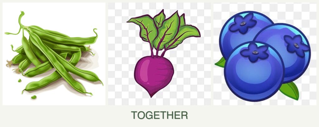 Pest Control and Nutrient Needs: Beans can fix nitrogen in the soil, which benefits many vegetables, but blueberries have unique nutrient needs that differ from those of beans and beets. Beets have few pest issues, but blueberries are prone to bird predation and require netting.