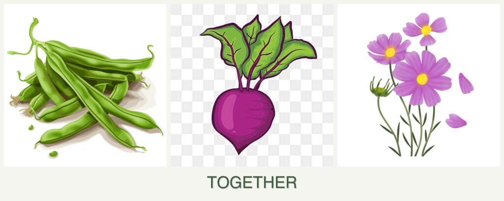 - Pest Control: Cosmos attract pollinators and beneficial insects that can help control pests that might affect beans and beets.
