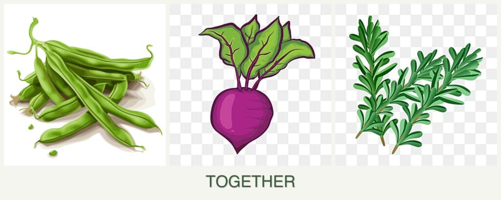 Growth Requirements: Beans are nitrogen-fixing legumes that enrich the soil, benefiting beets, which thrive in nutrient-rich environments. Rosemary, a hardy herb, can tolerate the conditions favored by both beans and beets.