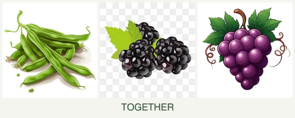- Growth Requirements: Beans are nitrogen-fixing plants, which can benefit blackberries and grapes by enriching the soil. However, blackberries and grapes have similar needs for sunlight and space, which might lead to competition.