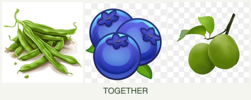 Nutrient Needs and Spacing: Beans are nitrogen-fixers, which can benefit many plants, but blueberries and plums have specific nutrient needs that may not align with the nitrogen-rich environment beans create.