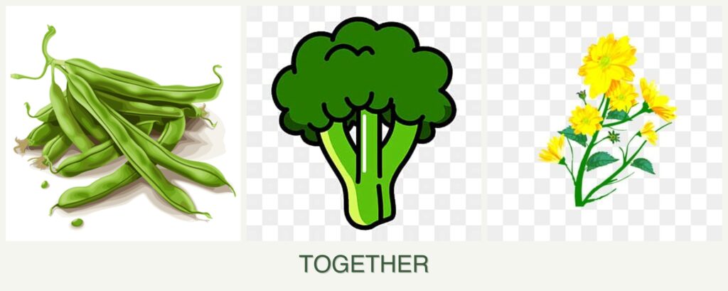 - Growth Requirements: Beans are nitrogen-fixers, enriching the soil for heavy feeders like broccoli. Calendula, with its shallow roots, doesn’t compete with beans and broccoli for nutrients.