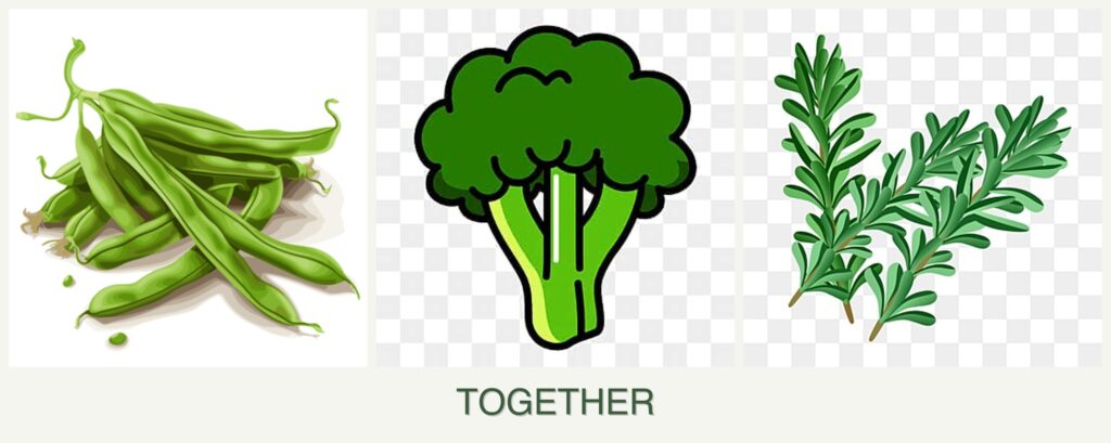 - Resource Competition: Beans and broccoli require consistent moisture, which may not suit rosemary’s preference for drier conditions.