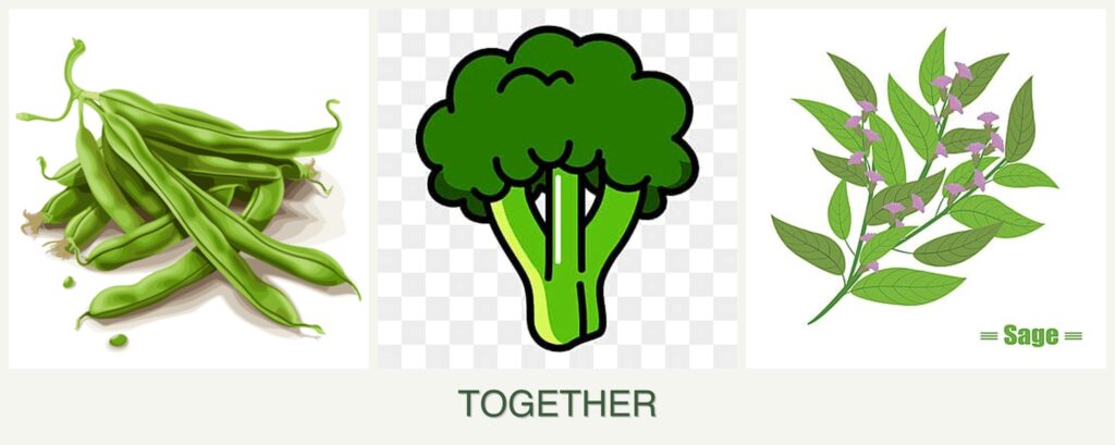 - Nutrient Needs: Beans improve soil nitrogen levels, benefiting broccoli. However, sage prefers less fertile soil, so balance is key.