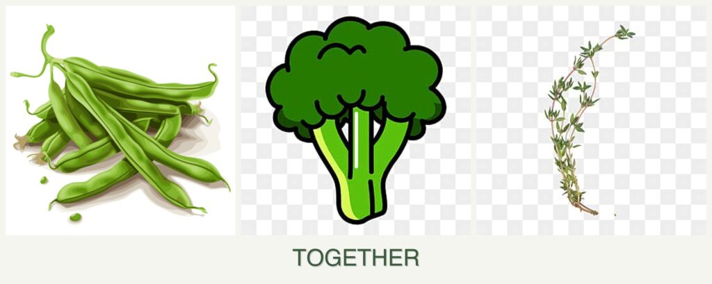 - Nutrient Needs: Beans replenish soil nitrogen, benefiting broccoli’s growth. Thyme’s low nutrient demands mean it won’t compete heavily.