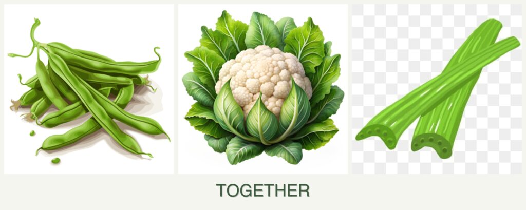 Beans thrive in full sun and prefer well-drained soil, while cauliflower and celery require consistent moisture and can tolerate partial shade. Beans’ ability to fix nitrogen is beneficial for cauliflower and celery, which are heavy feeders. However, all three plants have different spacing needs: beans need room to climb, cauliflower requires space for its broad leaves, and celery benefits from being planted in blocks for moisture retention.