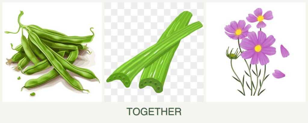 - Pest Control: Cosmos attract pollinators and beneficial insects, reducing pest issues for beans and celery.