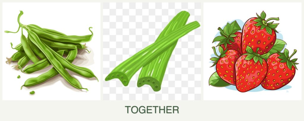 Growth Requirements: Beans are nitrogen-fixers, enriching the soil, which benefits many plants. However, celery has high water needs and prefers cooler conditions, while strawberries require well-drained soil and full sun. These differing needs can create challenges in meeting each plant’s optimal conditions.