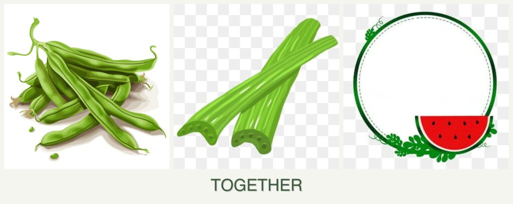 Growth Requirements: Beans are nitrogen fixers, benefiting other plants by enriching the soil. Celery prefers cooler conditions and consistent moisture, while watermelons require ample sunlight and space.