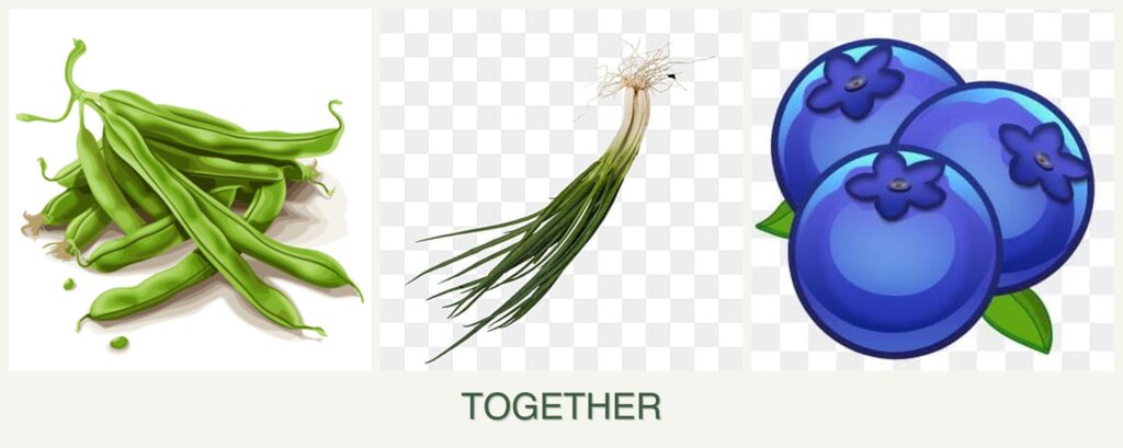 - Spacing: Beans and chives can be planted relatively close together, but blueberries need more space due to their bushy growth habit.