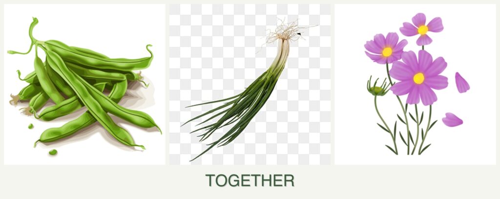- Nutrient Needs: Beans improve soil nitrogen levels, indirectly benefiting chives and cosmos.