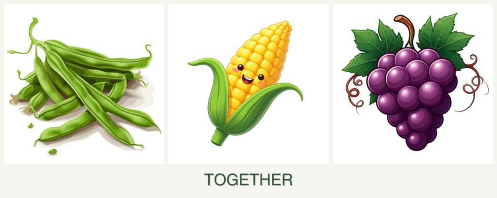 - Pest Control: Beans can deter pests that affect corn, while corn can provide shade and support. Grapes don’t directly repel pests for beans or corn but can benefit from the pest-repelling properties of beans.