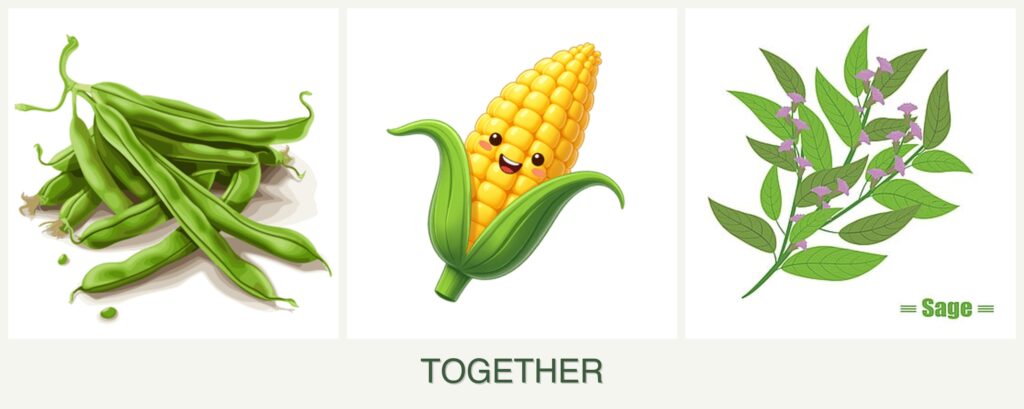 - Growth Requirements: Beans and corn thrive in similar conditions, needing full sun and well-drained soil. Sage prefers slightly drier conditions.