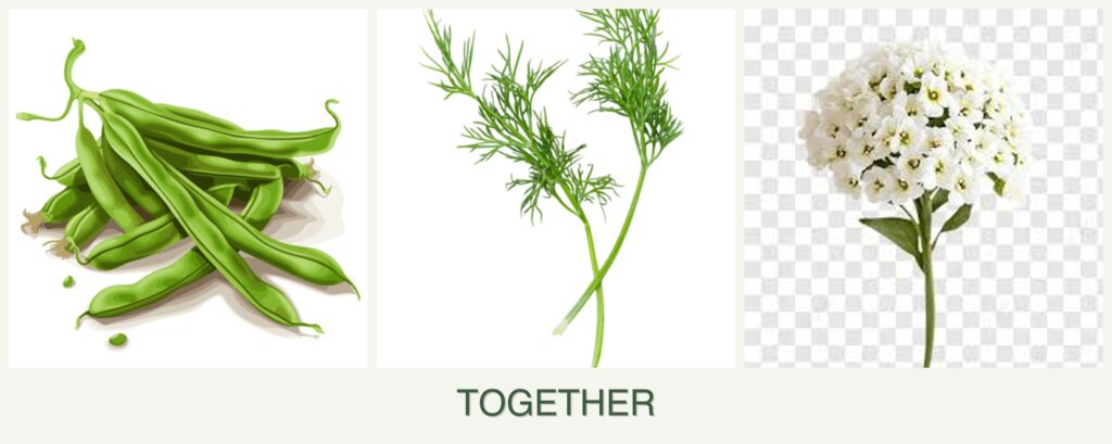 Dill’s aromatic leaves repel pests like aphids, while alyssum attracts beneficial insects such as hoverflies, which prey on pests. Together, they create a balanced ecosystem that supports the healthy growth of beans.