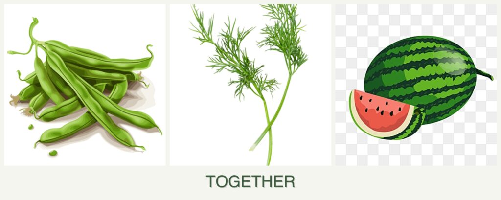 - Nutrient Needs: Beans are nitrogen-fixers, enriching the soil for nutrient-hungry melons. Dill, being a light feeder, wonโt compete heavily for nutrients.