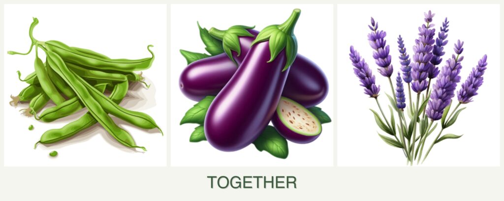 - Growth Requirements: Beans and eggplants thrive in similar conditions, preferring full sun and well-drained soil. Lavender, although different in some needs, can adapt to these conditions.