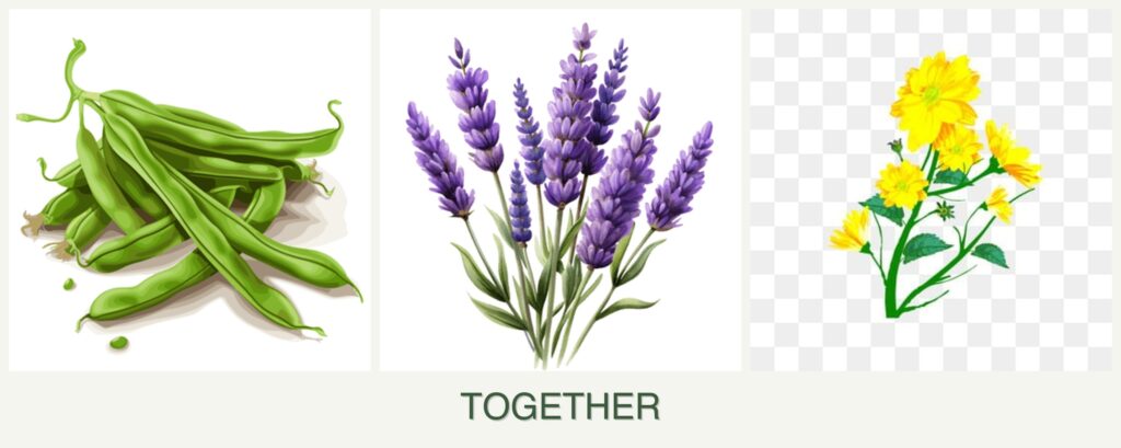 Nutrient Needs and Spacing: Beans are nitrogen-fixers, enriching the soil for surrounding plants. Lavender and calendula do not compete heavily for nutrients, and their root systems can coexist without overcrowding.