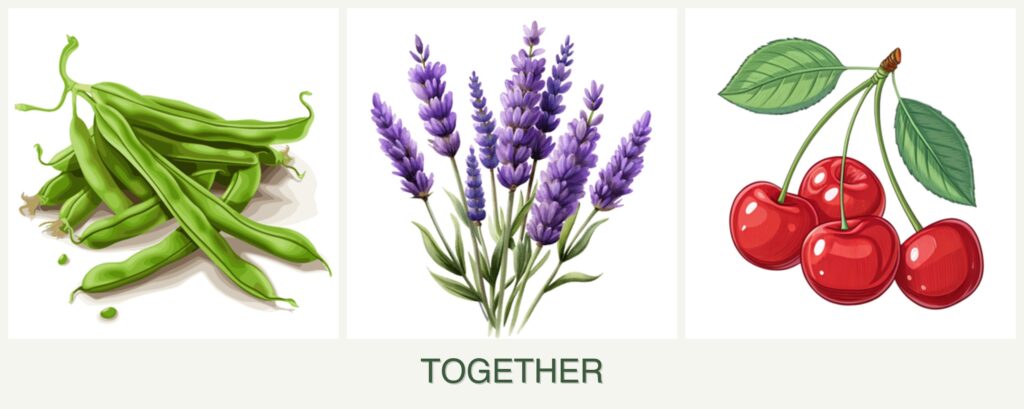 - Pest Control: Lavender’s scent repels pests, benefiting cherries. Beans improve soil nitrogen, aiding cherry growth.