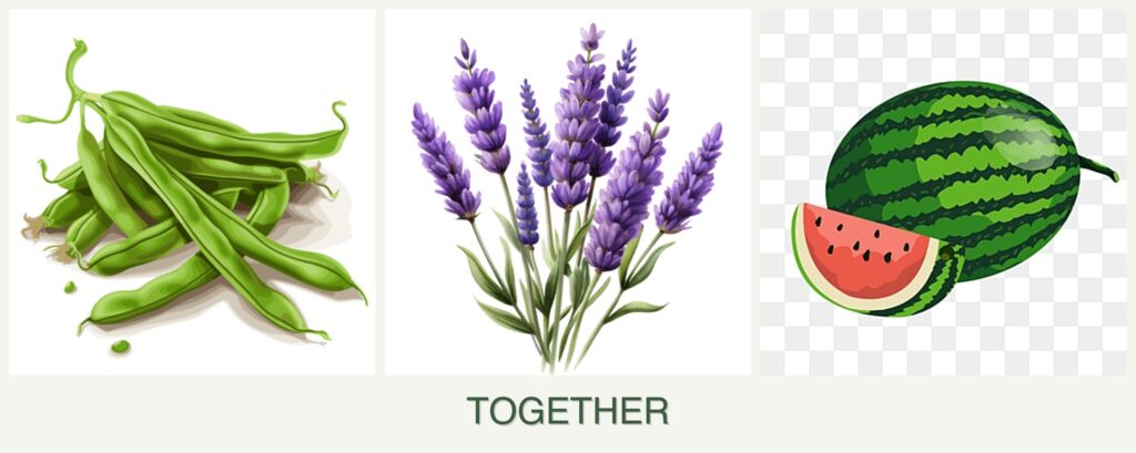 - Growth Requirements: Beans and melons both need full sun, while lavender prefers well-drained soil and can tolerate poorer conditions.