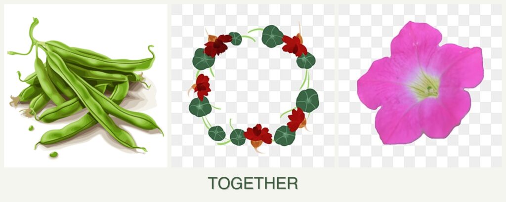 - Nutrient Needs: Beans improve soil nitrogen levels, supporting the growth of nasturtiums and petunias.