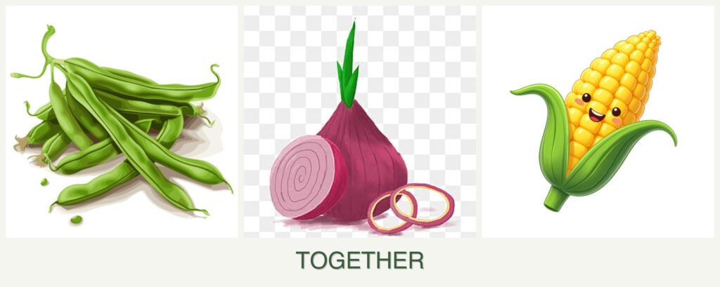 - Pest Control: Onions repel common pests like aphids and beetles, which can affect both beans and corn.