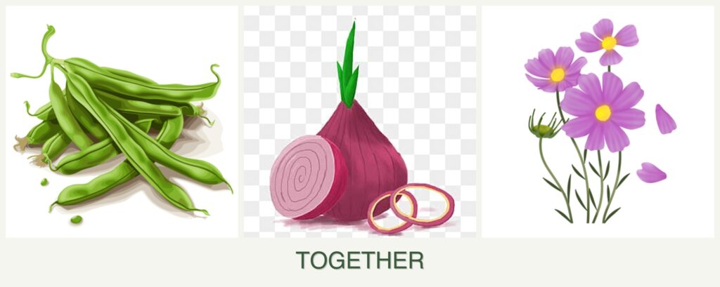 - Growth Requirements: Beans and cosmos thrive in full sun, while onions can tolerate partial shade.