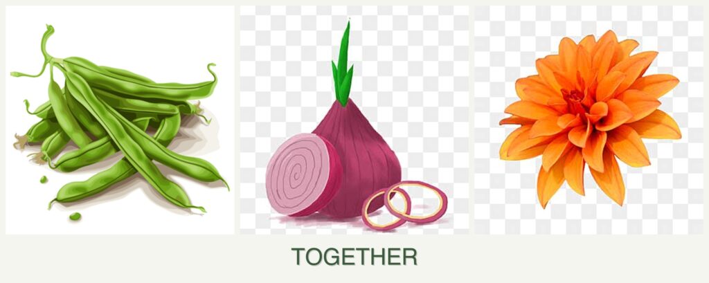 - Growth Requirements: Beans need full sun and well-drained soil, while onions prefer slightly acidic to neutral pH. Dahlias thrive in similar conditions to beans, making them compatible in terms of sunlight and soil.