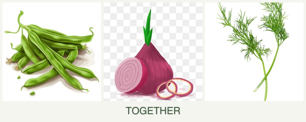 - Timing: Plant beans after the last frost, while onions and dill can be sown earlier in the season.