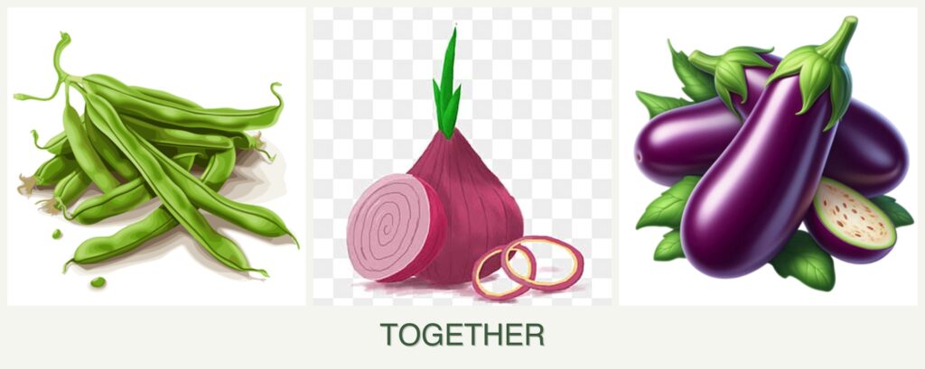 - Pest Control: Onions can deter aphids and other pests that may target beans and eggplants.