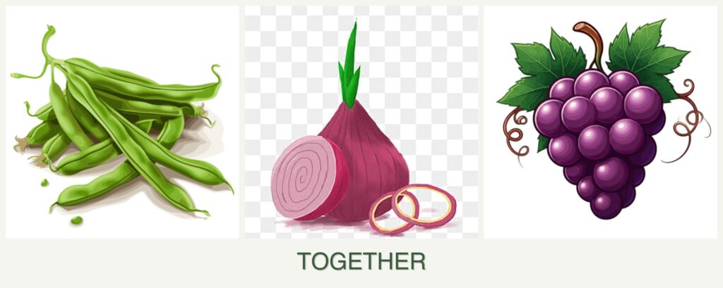While not ideal companions, planting beans, onions, and grapes in proximity can have some benefits:
