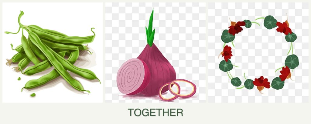 Planting beans, onions, and nasturtiums together offers several advantages:
