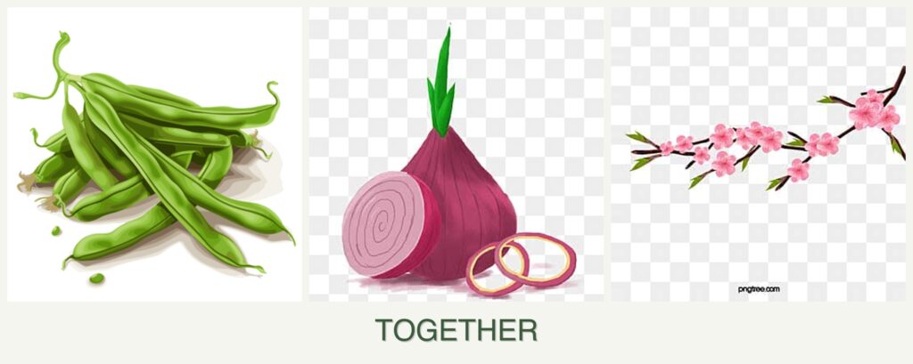- Onions act as natural pest repellents, deterring insects that might otherwise harm beans and peaches. Their pungent aroma can keep pests like aphids and beetles at bay.