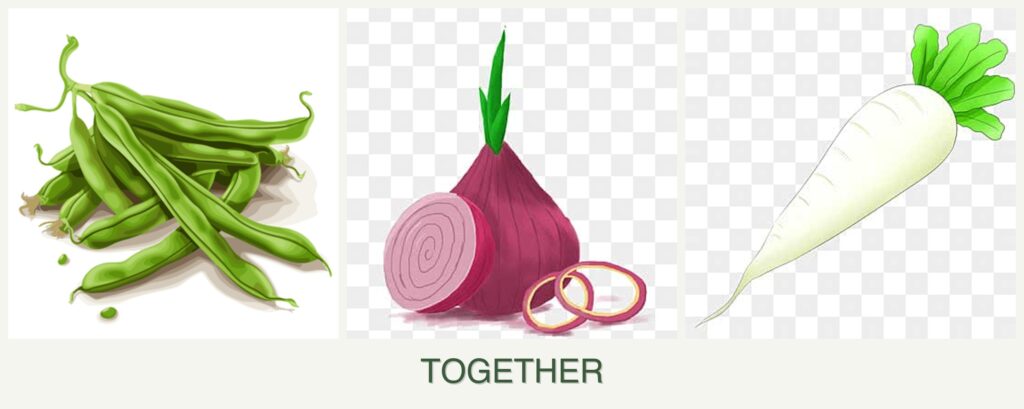 - Pest Control: Onions repel pests that target beans, and radishes can act as trap crops for flea beetles.
