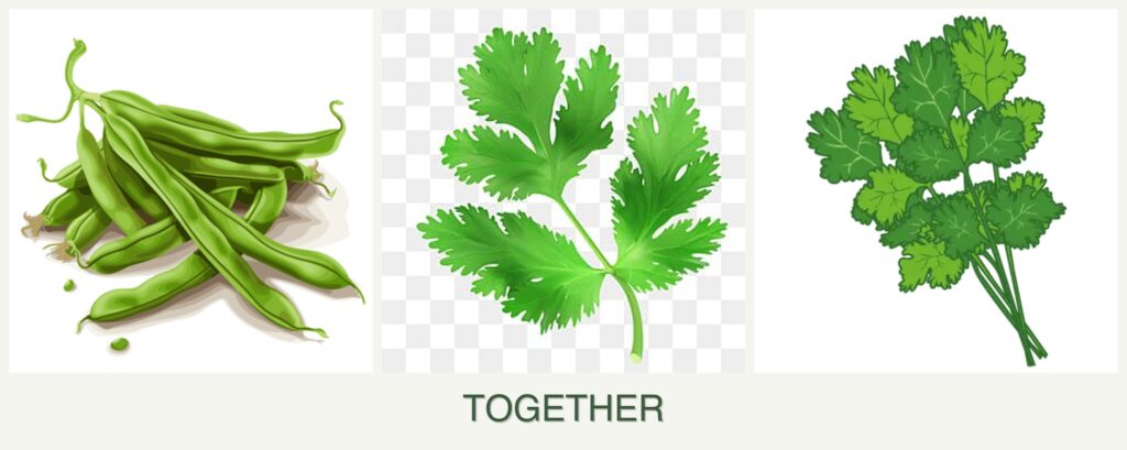 - Growth Requirements: Beans, parsley, and cilantro thrive in similar conditions, needing well-drained soil and full sun to partial shade.