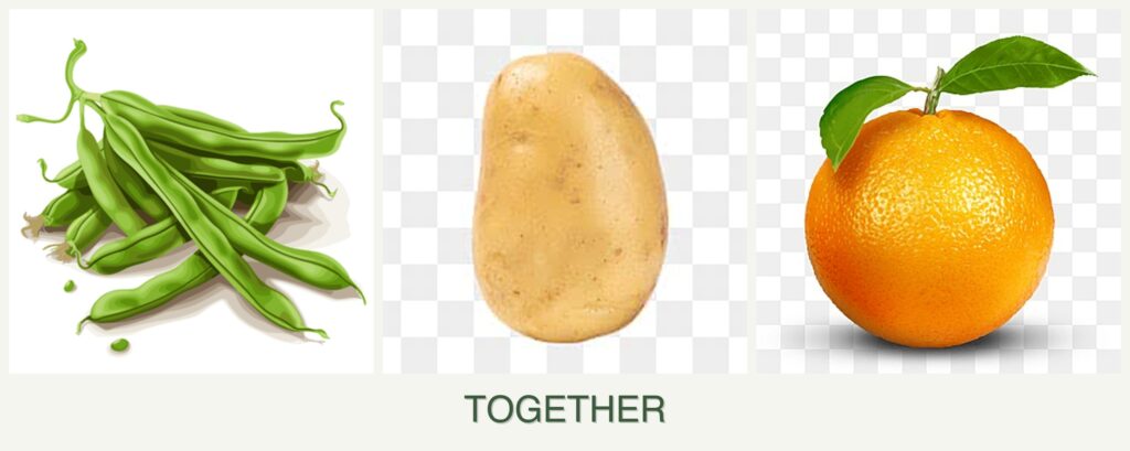 - Growth Requirements: Beans and potatoes share some sunlight and water needs but differ significantly from oranges.