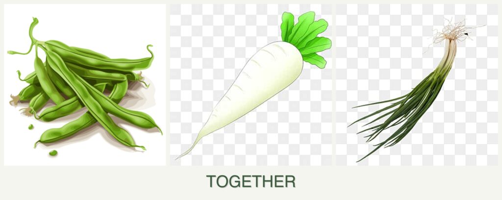 - Nutrient Needs: Beans enrich the soil with nitrogen, benefiting radishes and chives.