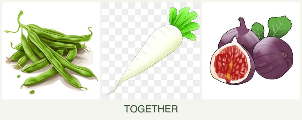Nutrient Needs: Beans improve soil nitrogen levels, benefiting radishes. Figs have different nutrient needs, often requiring more potassium and phosphorus.