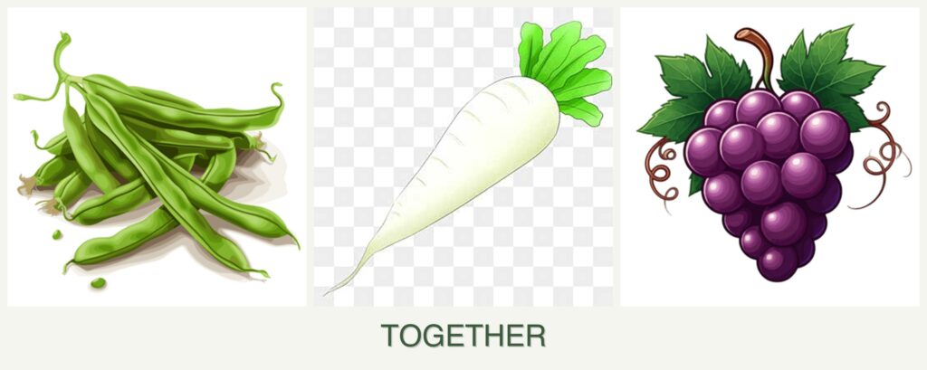 - Nutrient Needs: Beans fix nitrogen in the soil, which can benefit both radishes and grapes, but grapes may need additional fertilization.