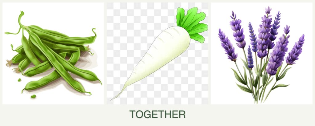 - Growth Requirements: Beans and radishes both prefer moist, well-drained soil, whereas lavender needs drier conditions.