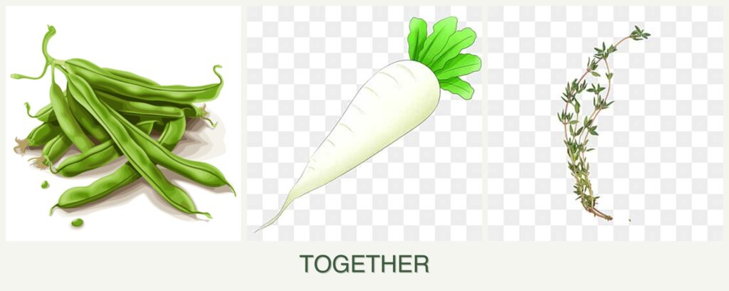 - Nutrient Needs: Beans fix nitrogen in the soil, benefiting the nutrient needs of radishes and thyme.