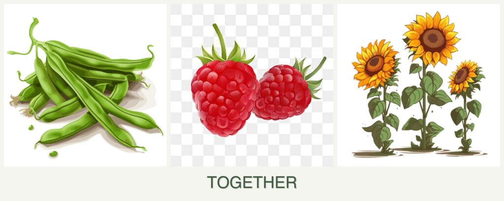- Growth Requirements: Beans are nitrogen-fixing plants, enriching the soil and benefiting sunflowers, which are heavy feeders. Raspberries, however, have specific water and space needs that must be managed.