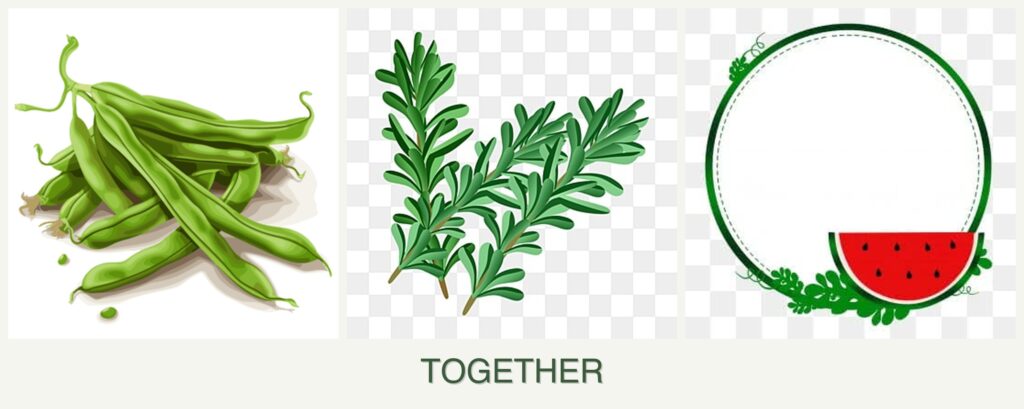 Growth Requirements: Beans thrive in nitrogen-rich soil, which they help create, but rosemary prefers well-drained, slightly acidic to neutral soil. Watermelons require a lot of space and nutrients, which can be depleted by beans and rosemary.