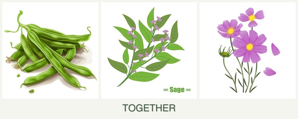 - Pest Control: Sage’s aromatic leaves deter pests that commonly affect beans, while cosmos attracts beneficial insects.