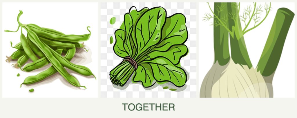 - Timing: Plant spinach in early spring or fall; beans after the last frost; fennel in early spring.