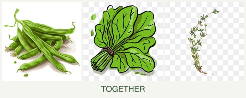 - Pest Control: Thyme’s aromatic oils can repel certain pests that might attack beans and spinach.
