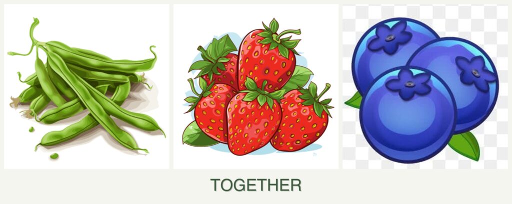 - Nutrient Needs: Beans fix nitrogen, benefiting strawberries but not blueberries due to differing soil needs.