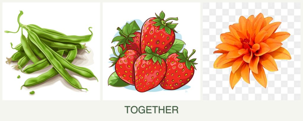 Pest Control: Beans can help deter pests that commonly affect strawberries, while dahlias attract pollinators, benefiting both beans and strawberries.
