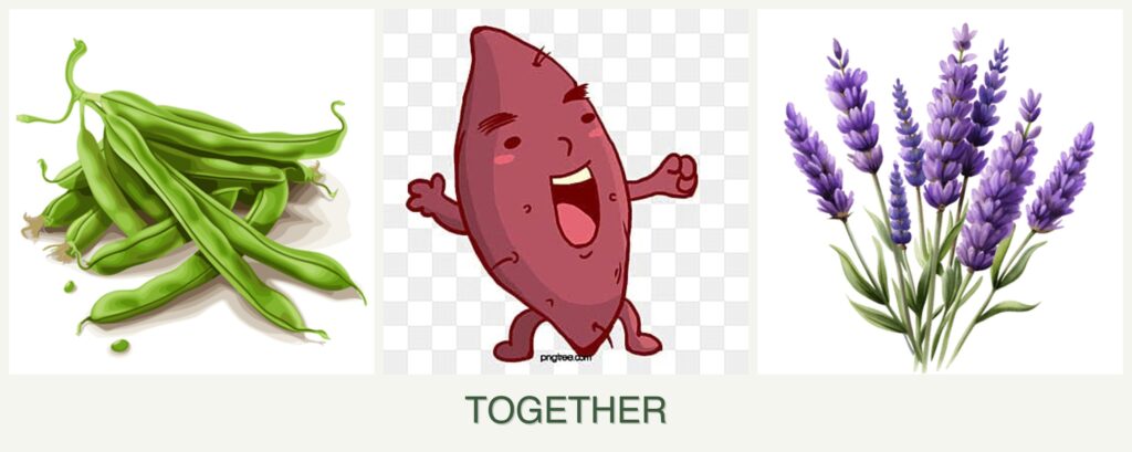 - Nutrient Needs: Beans enhance soil nitrogen, benefiting sweet potatoes. Lavender does not compete heavily for nutrients.
