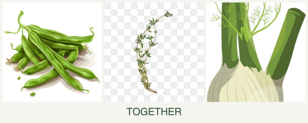 Growth Requirements: Beans and thyme share similar sunlight and water needs, thriving in full sun and well-drained soil. However, fennel tends to release chemicals that can stunt the growth of nearby plants, particularly legumes like beans.