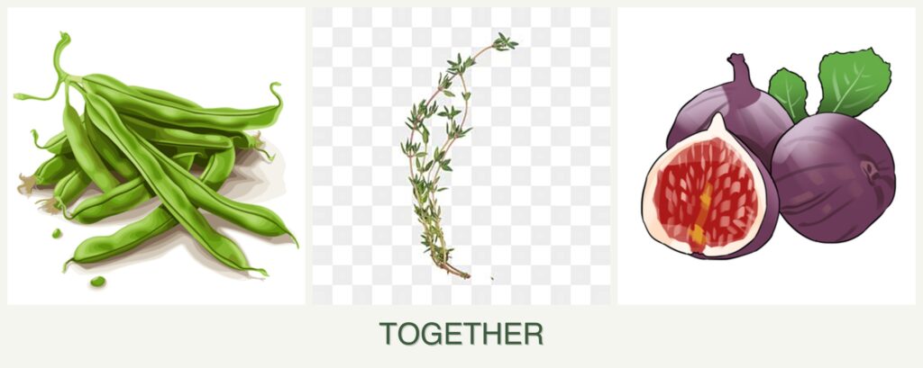 - Growth Requirements: Beans prefer full sun and well-drained soil, similar to thyme. Figs also thrive in full sun but require more space due to their larger size.